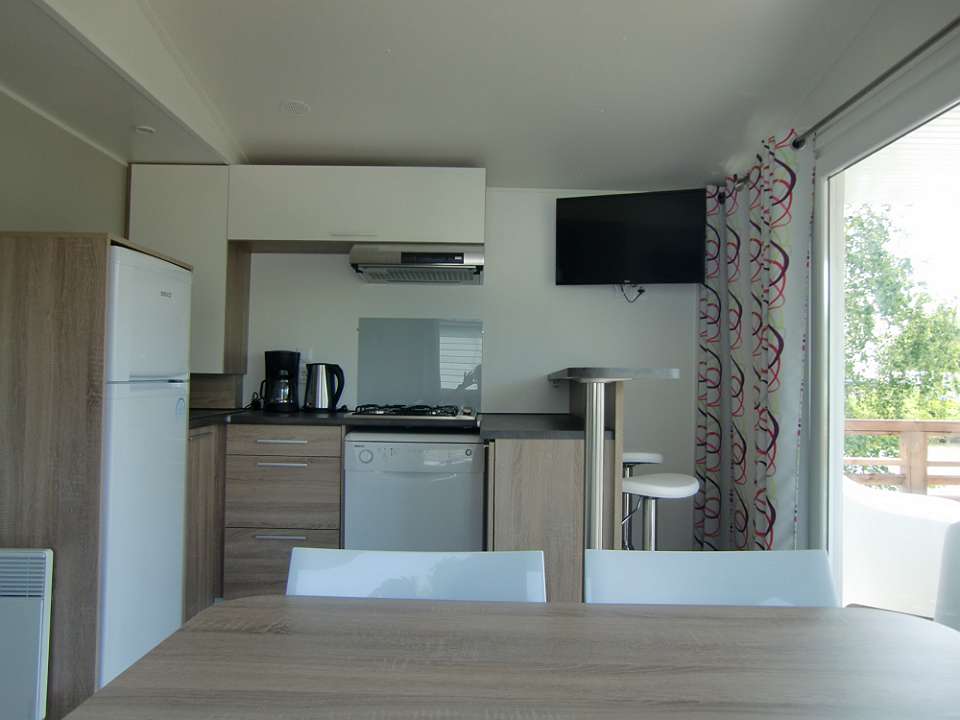 De moderne, open keuken is voorzien van een ruime koelkast met vriesvak, een filterkoffiezetapparaat, een waterkoker, gasfornuis met afzuigkap en een vaatwasser. In de aangrenzende living vindt u een hoekbank met tafel en een televisie. Op de veranda met tuinmeubilair kijkt u uit over de groene visvijvers. In de aangrenzende, ruime tuin kunt u aan de houten tafel of in de ligstoel genieten van uw welverdiende vakantie!